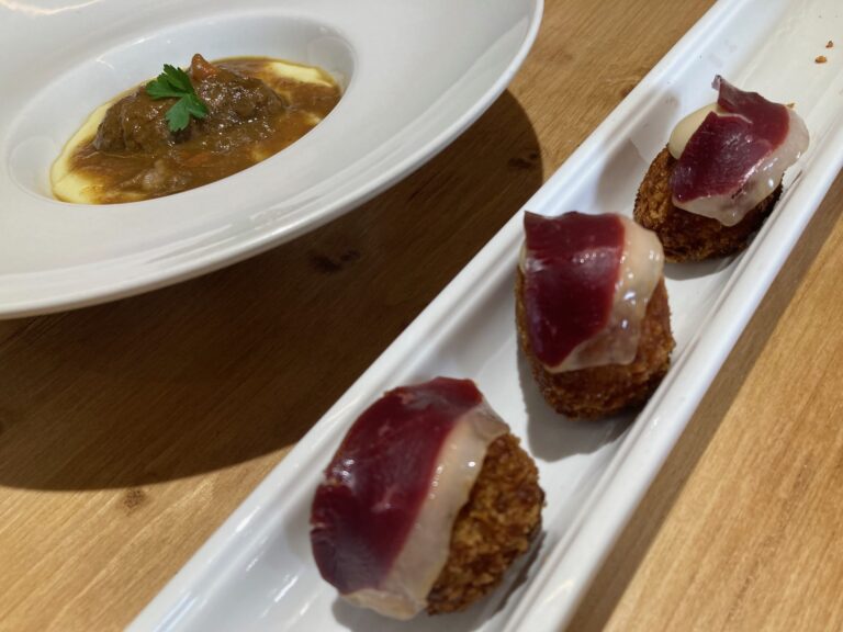 En cuanto a la gastronomía, optamos por probar las croquetas de foie con piñones y jamón de pato, nubes crocantes de atún rojo de almadraba y aguacate, carrillada de la abuela con mousse de patata trufada, tartar de atún rojo de almadraba con base de aguacate de Málaga y lima, colita de rape negro con perlas de tapioca en su jugo y perla de vieira con sombrero de carabinero, gran torrija francesa con helado de canela y limón, bolo de chocolate belga con sombrero de leche y canela.