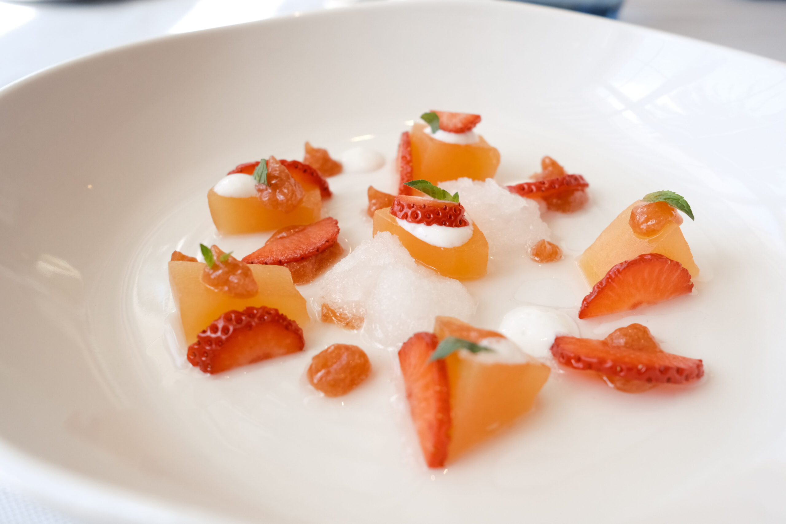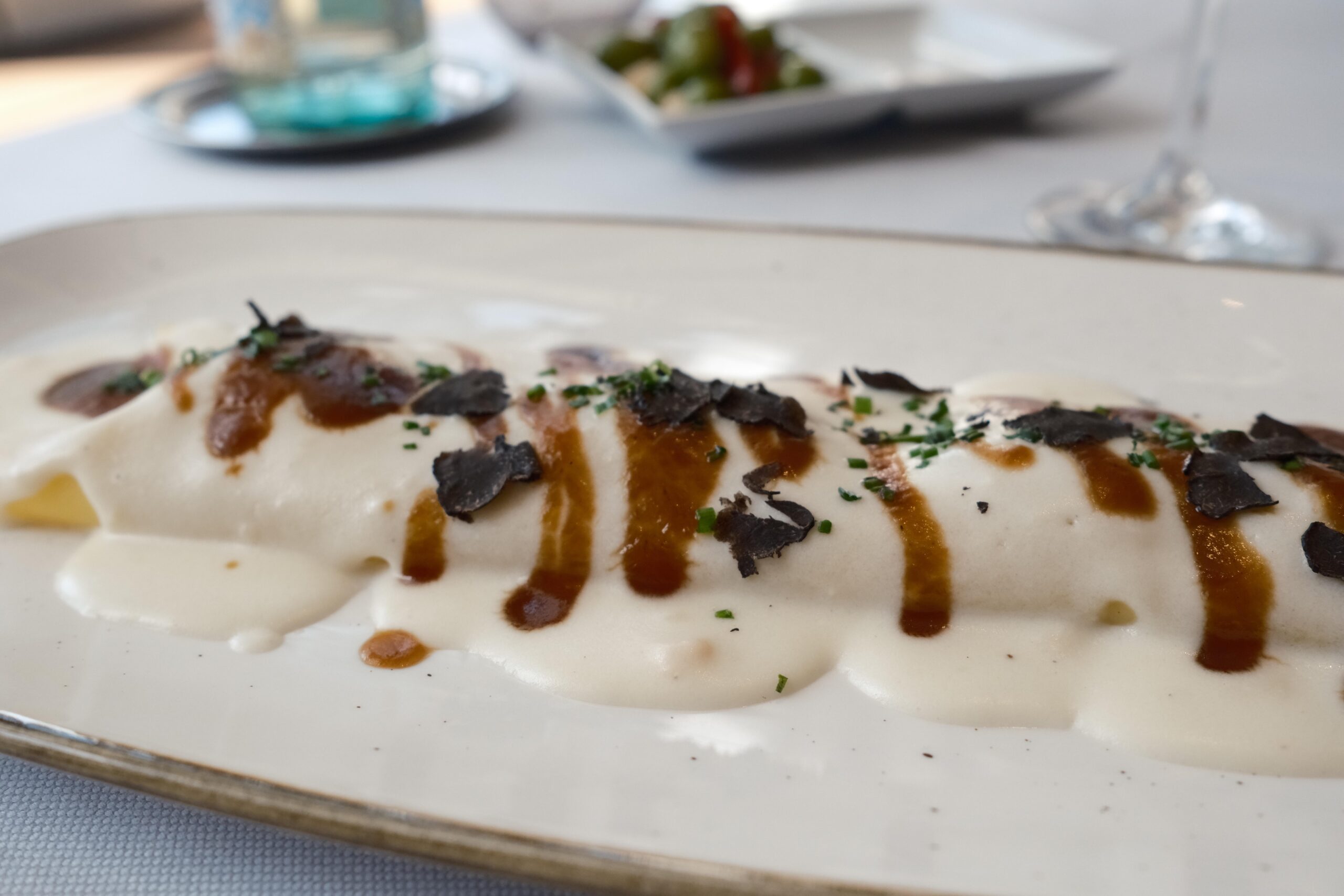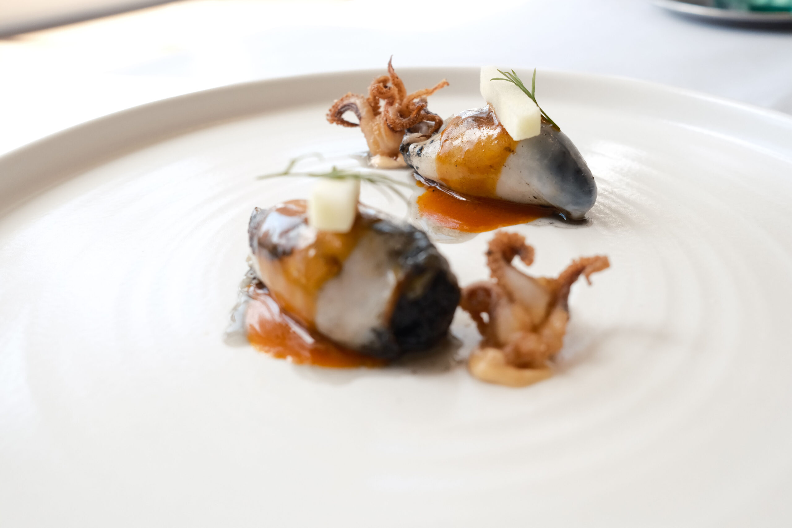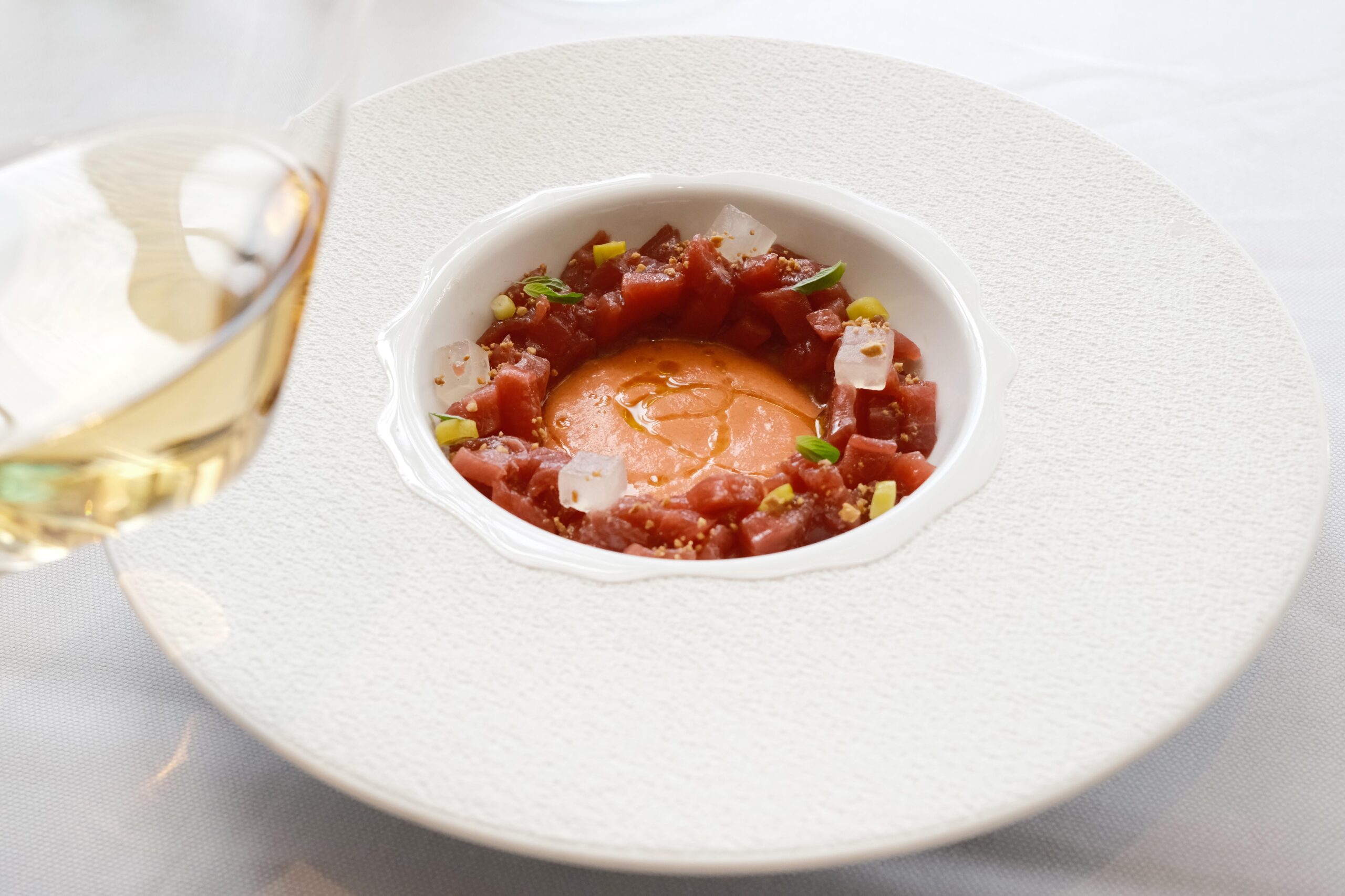 En el tintero se han quedado para una próxima visita otras propuestas como: Tomates en texturas esencia de ensalada líquida, cebolleta fresca y granizado de su jugo; Raviolis de langostinos puerros y setas de temporada con gazpachuelo del puchero, caviar de vermú y hierbabuena; Salmonetes soasados sobre ajoblanco de coco, higos y gel de apio‑manzana, Falso risotto con magret de pato a la brasa, foie y matices de cereza negra y el Chocolate, pan y aceite: coulant de chocolate 70%, helado de pan tostado y AOVE de Ronda.
